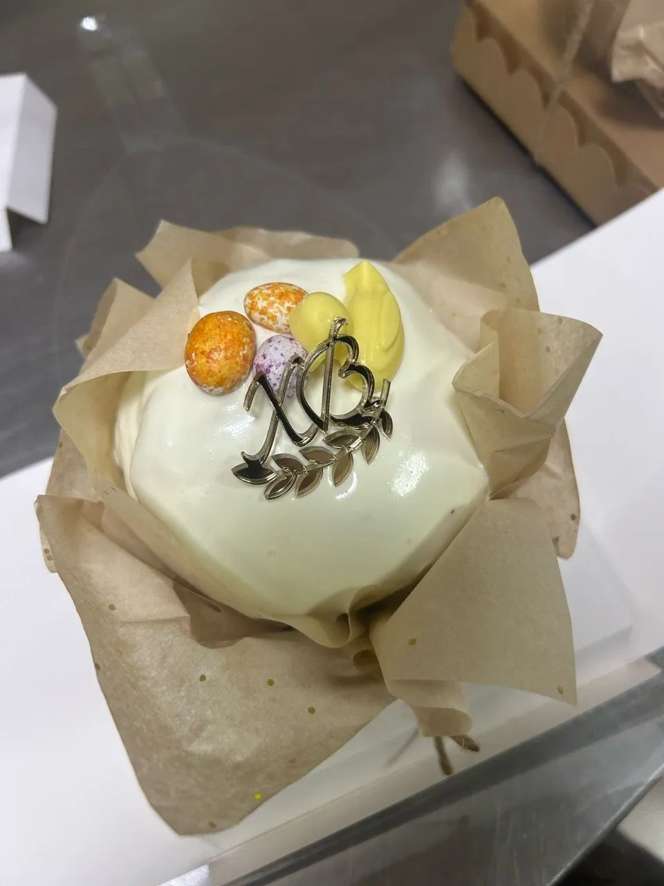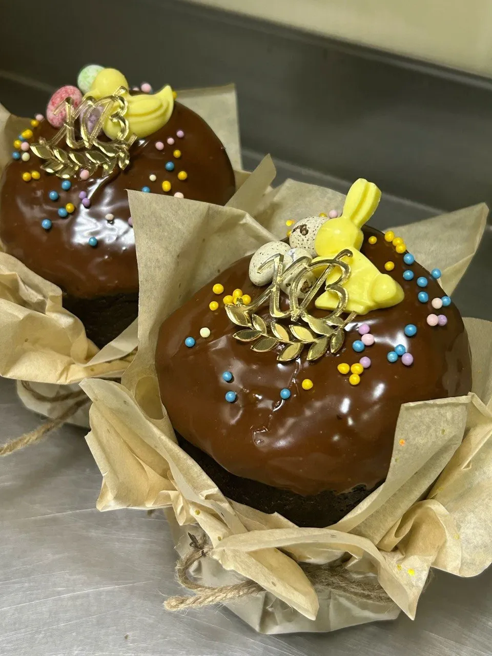 Все пасхи выполнены в шоколадном корпусе с кусочками орешков и украшены нежным ганашем-пломбир.